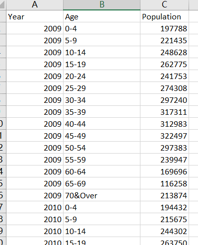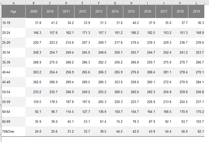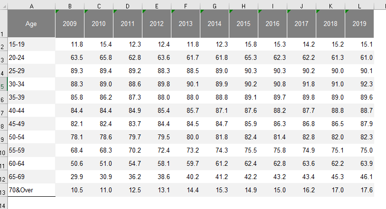Originally, we have the absolute number of labour force and labour force participation rate by age group in a format as following. The columns represent different years and the rows represent different age range.