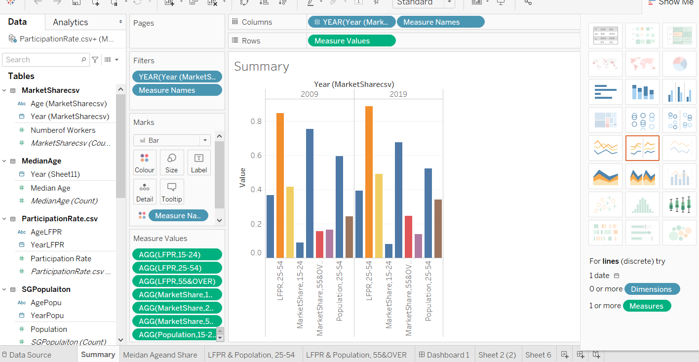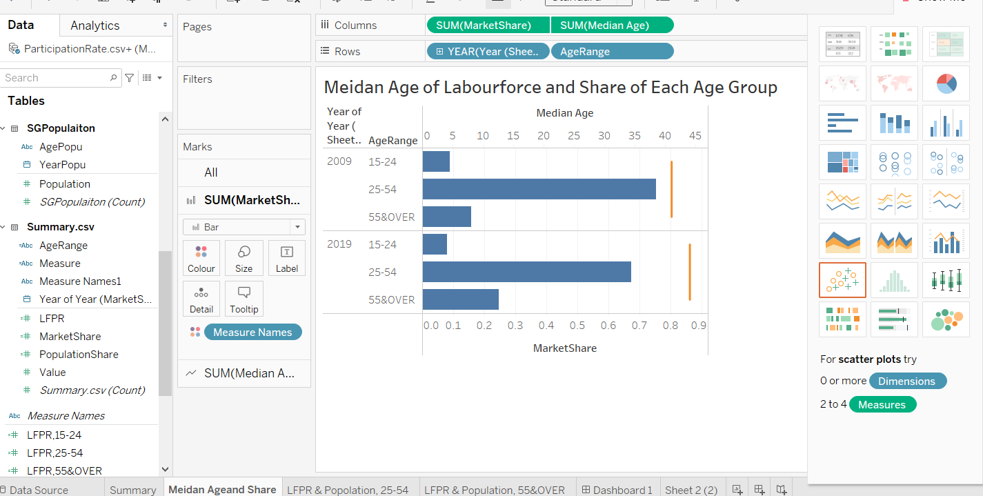 Now we can draw the graphs we want to have in our dashboard. We say that we want to have a scatter plots under show me and we want to have market share and median age in columns and year and age range in rows (note that the order matters here because we want to group the values by age range for each year) Then we change the graph type to be bar for market share and to be line for median age. We say we want to set the color of the graphs by measure names