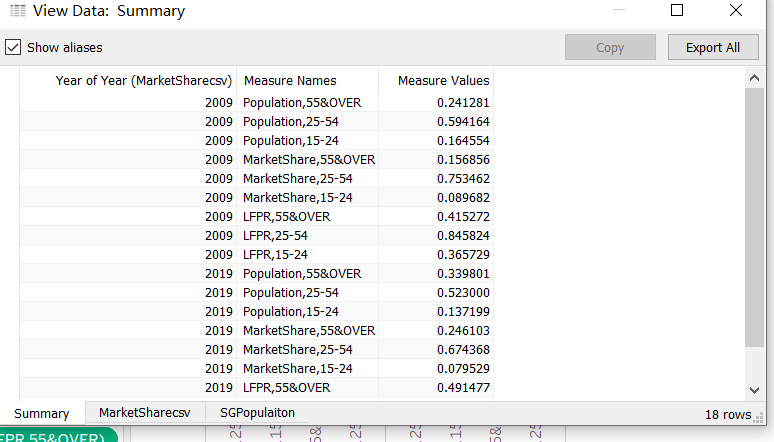 | As a visualization aims to show numbers in charts and represent then in a more organized and understandable way, we are not supposed to have a table in it. | Removed the table and reorganized the dashboard. The main part of the dashboard will consist of three graphs: Graph A: A graph combing a bar chart showing the share of labour force in the three age ranges and a line showing the median la bour force age for year 2009 and year 2019. Graph B: A graph showing the change of LFPR and population share of residents aged 25-54 throughout the period from 2009 to 2019. Graph C: A graph showing the change of LFPR and population share of residents aged 55 and over throughout the period from 2009 to 2019. |