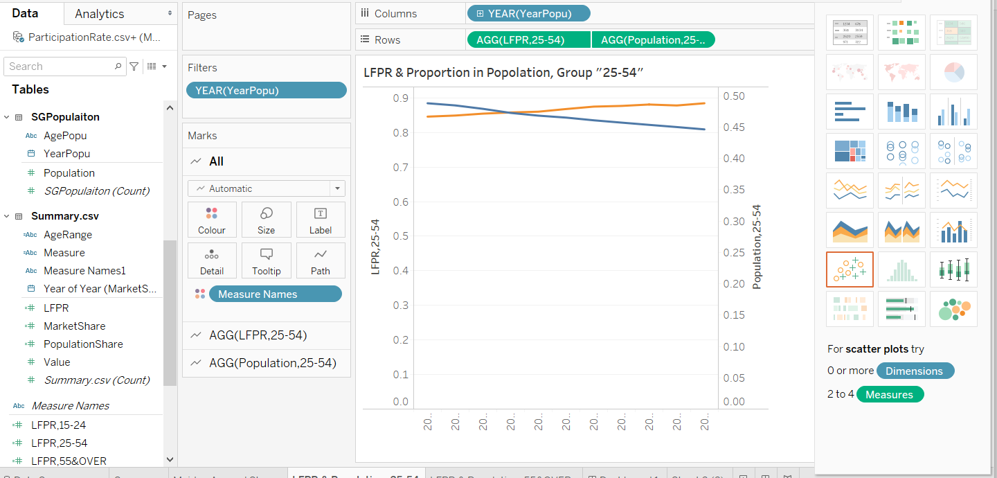 To look into the causes of the changes in median age and market share of labour force of different age groups, we also want to have two more charts showing change of LFPR and population throughout the period from 2009 to 2019for age group “25-54” and “55&over” We say that we want to have a scatter plots under show me and we want to have year in columns and LFPR,25-54 and Population,25-54 in rows. We only need observations for year 2009 and 2019, so we create a filter using year and filter out the years that we do not need.