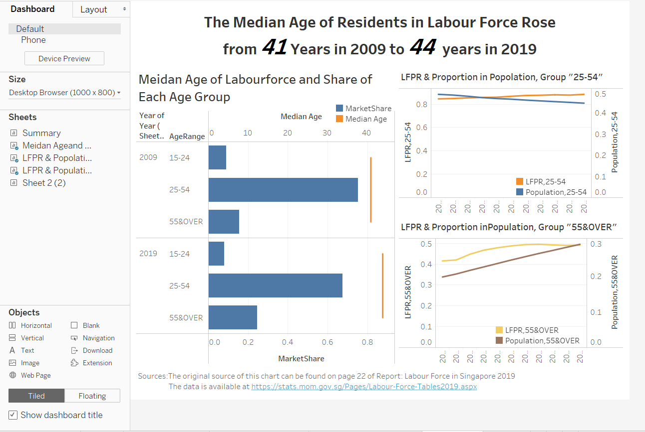 | The title is not clear enough as it does not point out what exact aspect(s) of labour force it would represent. Instead of saying “Residents Labour Force by Age”, “Meidan Age of Labourforce and Share of Each Age Group” would be better. | Set the title to be “Median Age of Labourforce and Share of Each Age Group”. |