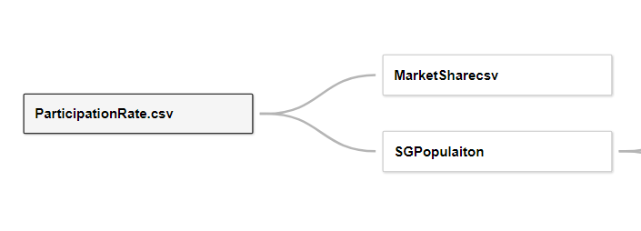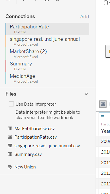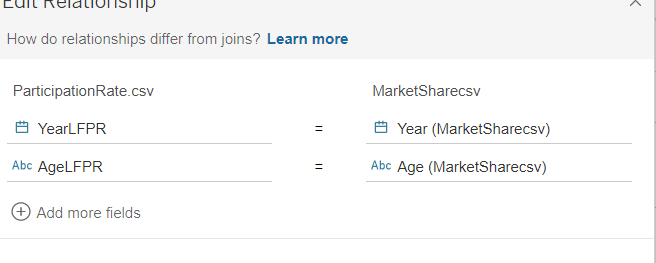 We connect the result tables (and the population table) to tableau and then drag the relevant sheets to the relationship generation area. We say the relationship is age=age and year=year.